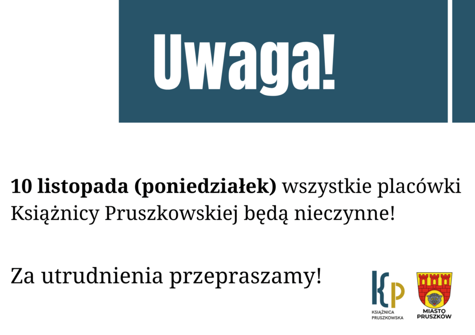 10 listopada (poniedziałek) wszystkie placówki Książnicy Pruszkowskiej będą nieczynne!