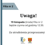 Uwaga! 19 listopada (środa) Filia nr 2będzie czynna od godziny 12:30. Przepraszamy za utrudnienia! - Uwaga!