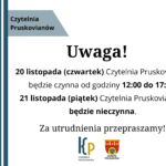 Uwaga! 20 listopada (czwartek) Czytelnia Pruskovianów będzie czynna od godziny 12:00 do 17:00!21 listopada (piątek)… Dowiedz się więcej: Uwaga! - Tydzień z Książnicą Pruszkowską