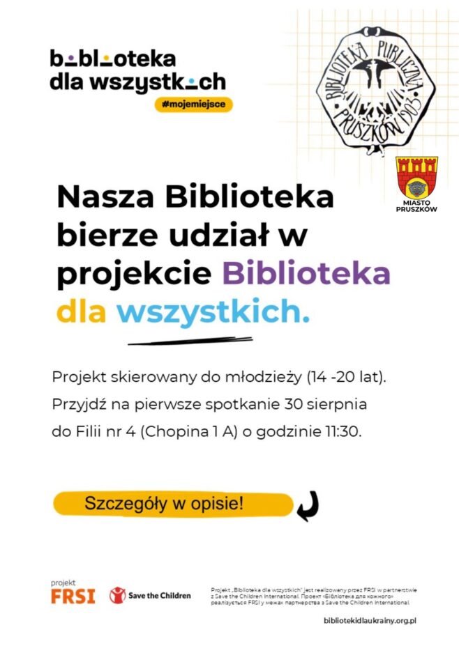 Projekt “Biblioteka dla wszystkich” jest realizowany przez Fundację FRSI w partnerstwie z Save the Children Poland w ramach Programu Rozwoju Bibliotek.