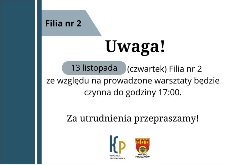 Filia nr 2 zmiana godzin otwarcia 13 listopada