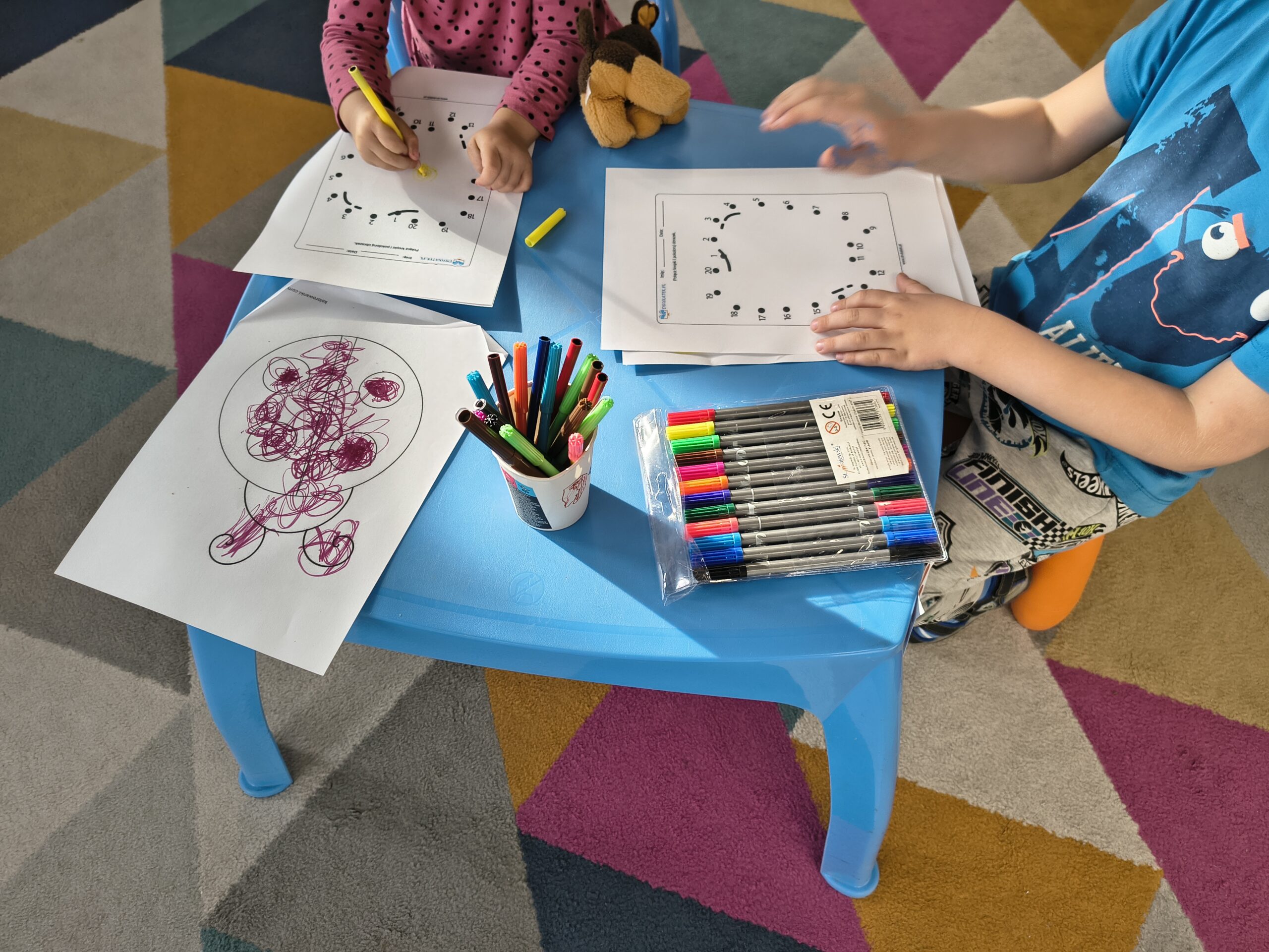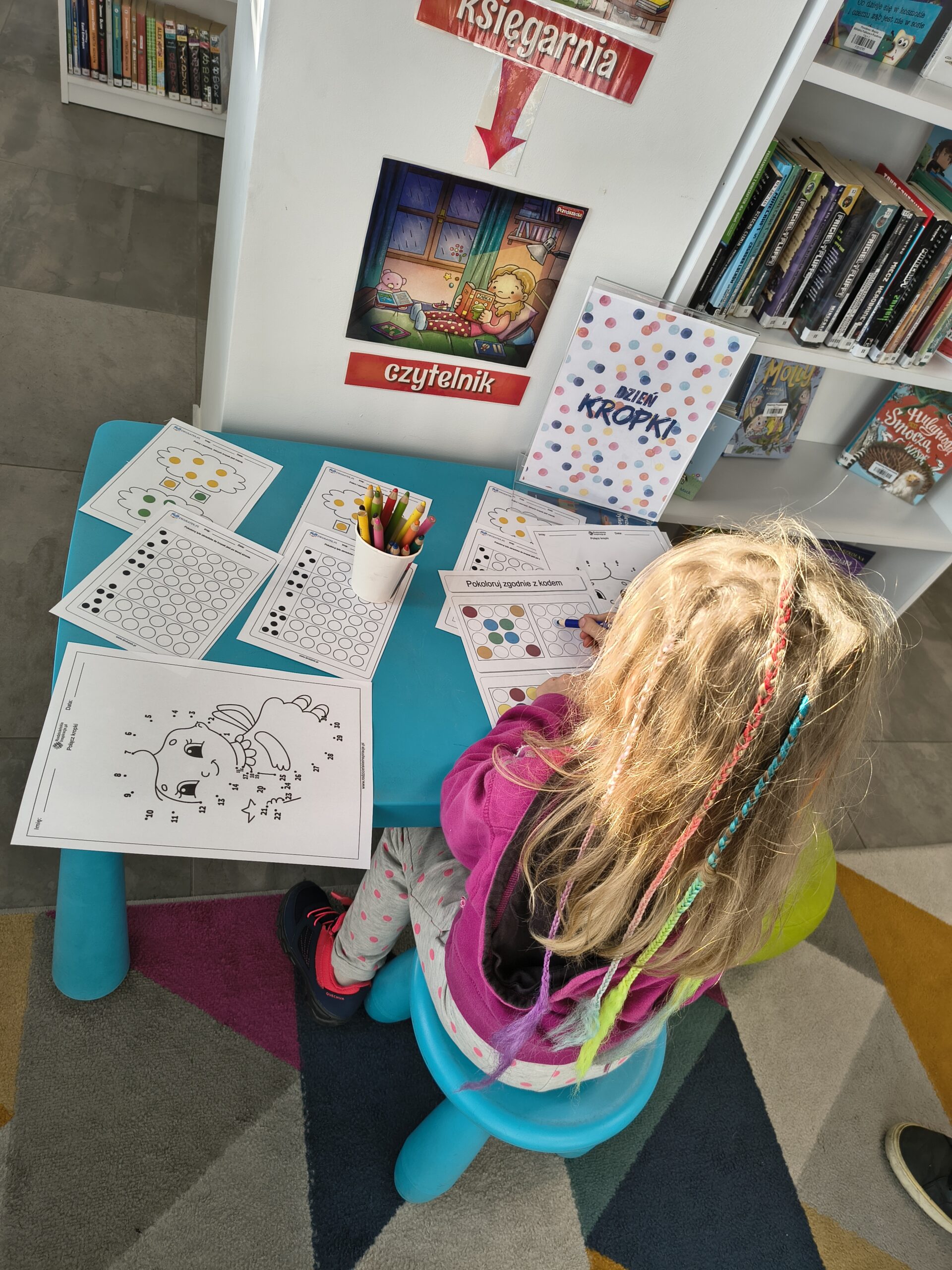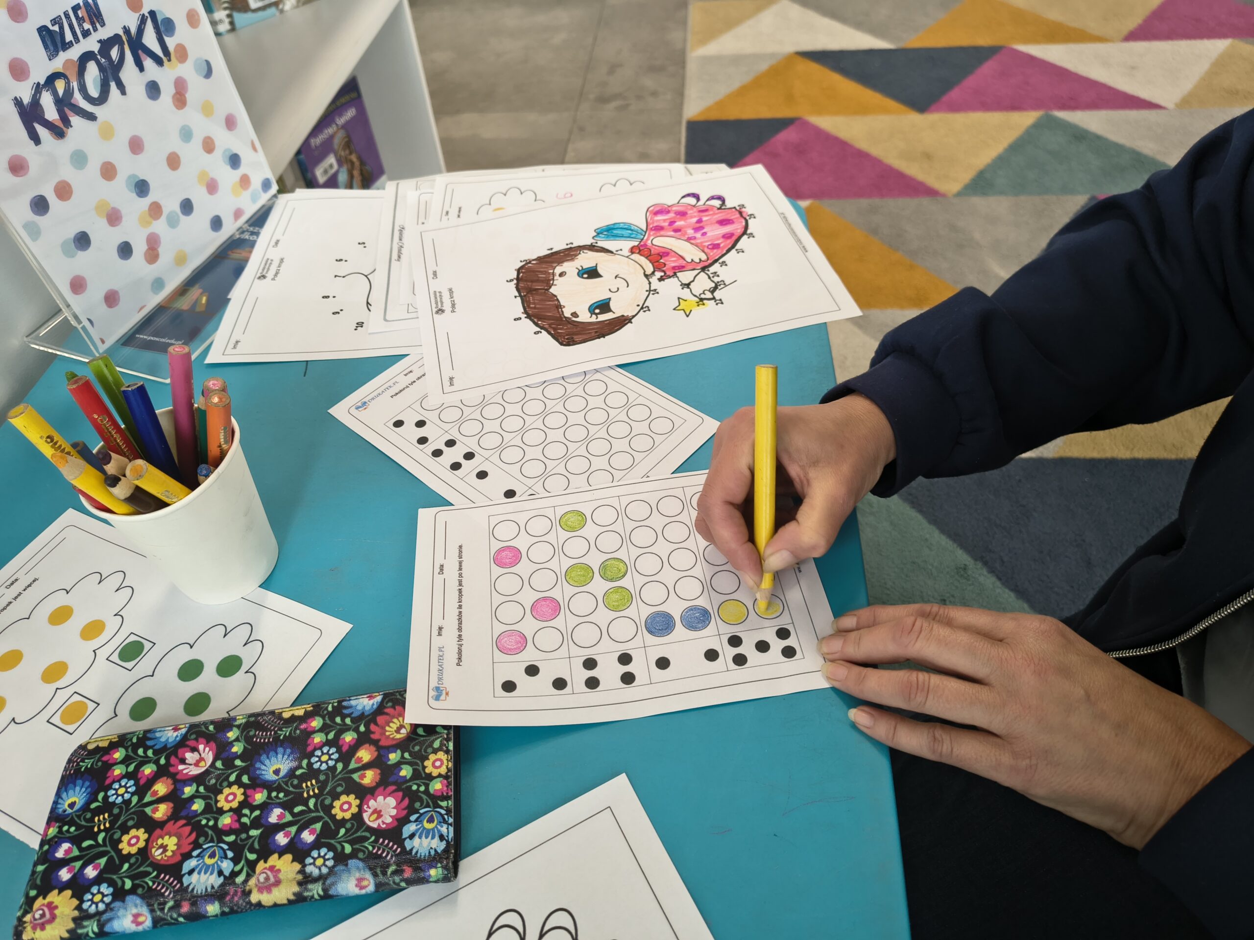 Potem czekało na nas malowanie po kropkach. Na początku wyglądało to jak zwykłe punkciki na kartce, a później zamieniały się w piękne obrazki. Każdy zrobił coś innego i wszystkie prace były bardzo kolorowe.