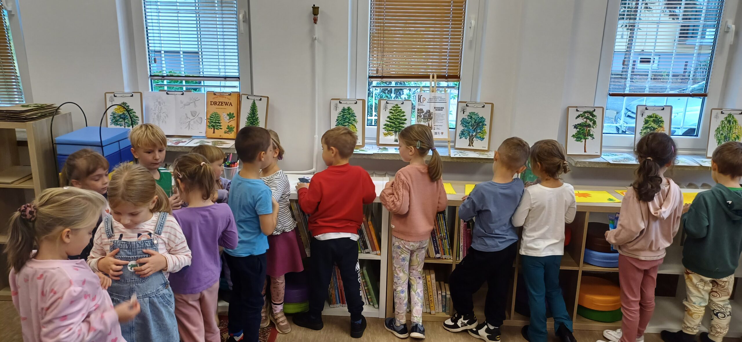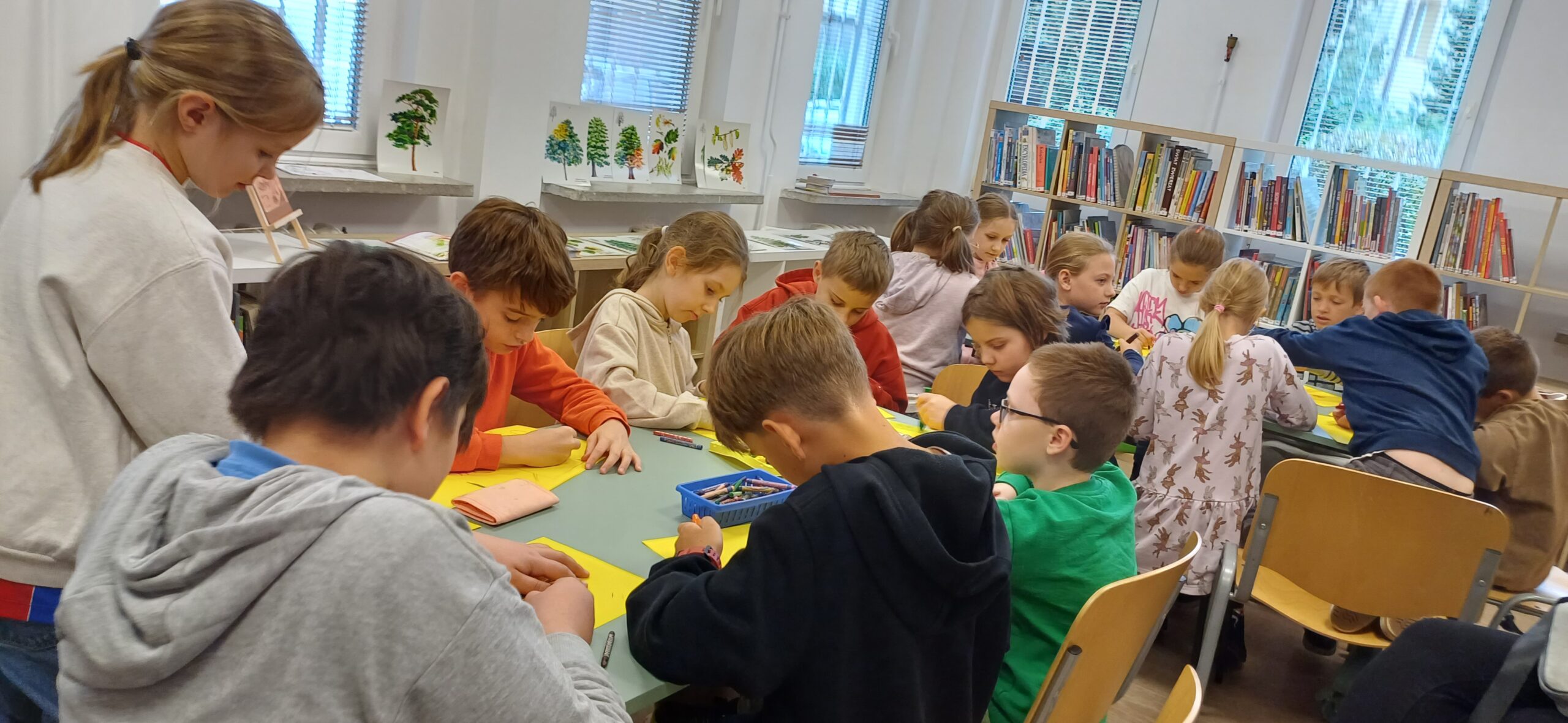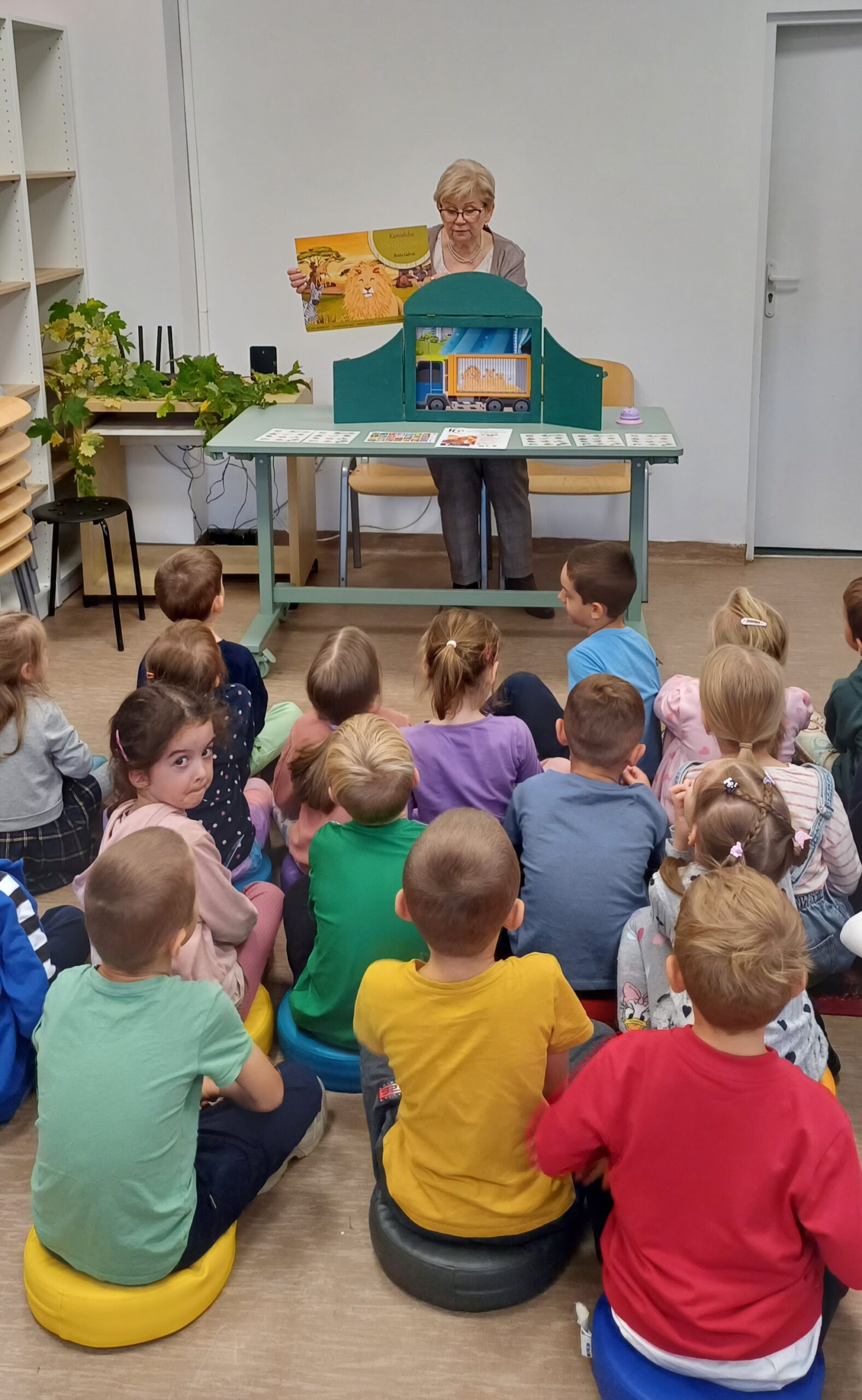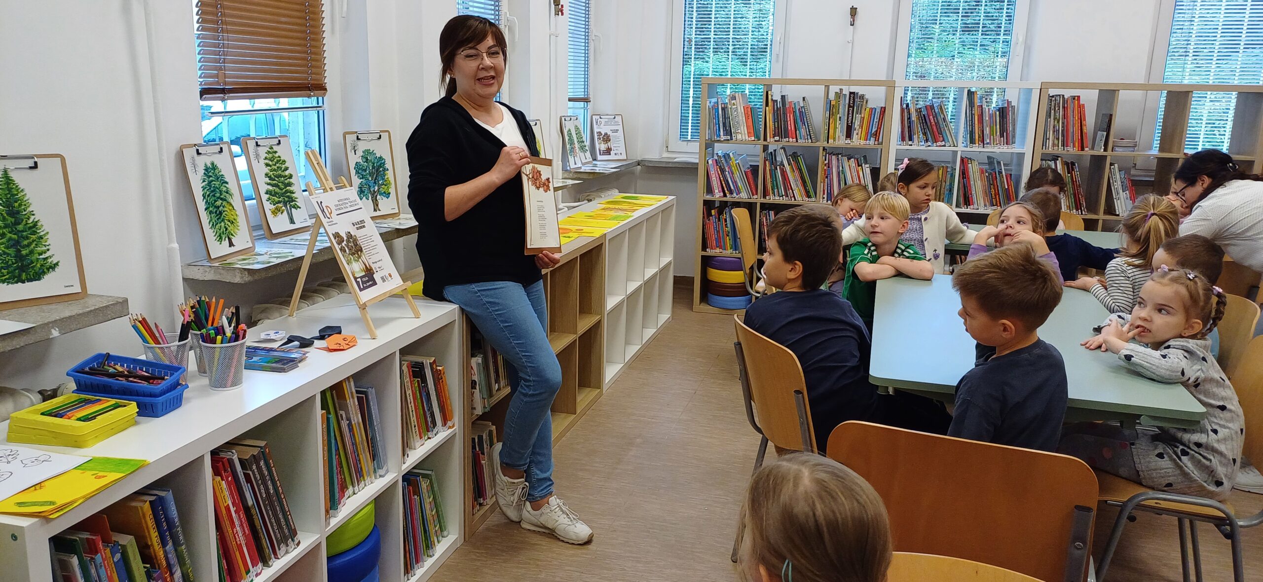 Z okazji Dnia Zwierząt i Dnia Drzewa dzieci z Przedszkola Miejskiego nr 12 obejrzały teatrzyk kamischibai pt. „Powrót do domu” – opowiadający historię uprowadzonych małych lwiątek. Następnie podczas spotkania z poezją poznały wiersze o drzewach – J. Brzechwy, M. Strzałkowskiej i H. Zdzitowieckiej. A, po ich wysłuchaniu tworzyły prace plastyczne z wykorzystaniem liści. Wydarzenie uświetniła wystawka edukacyjna – „Świat wokół nas – Drzewa”. Dziękujemy za czas spędzony w naszej bibliotece. Do zobaczenia!