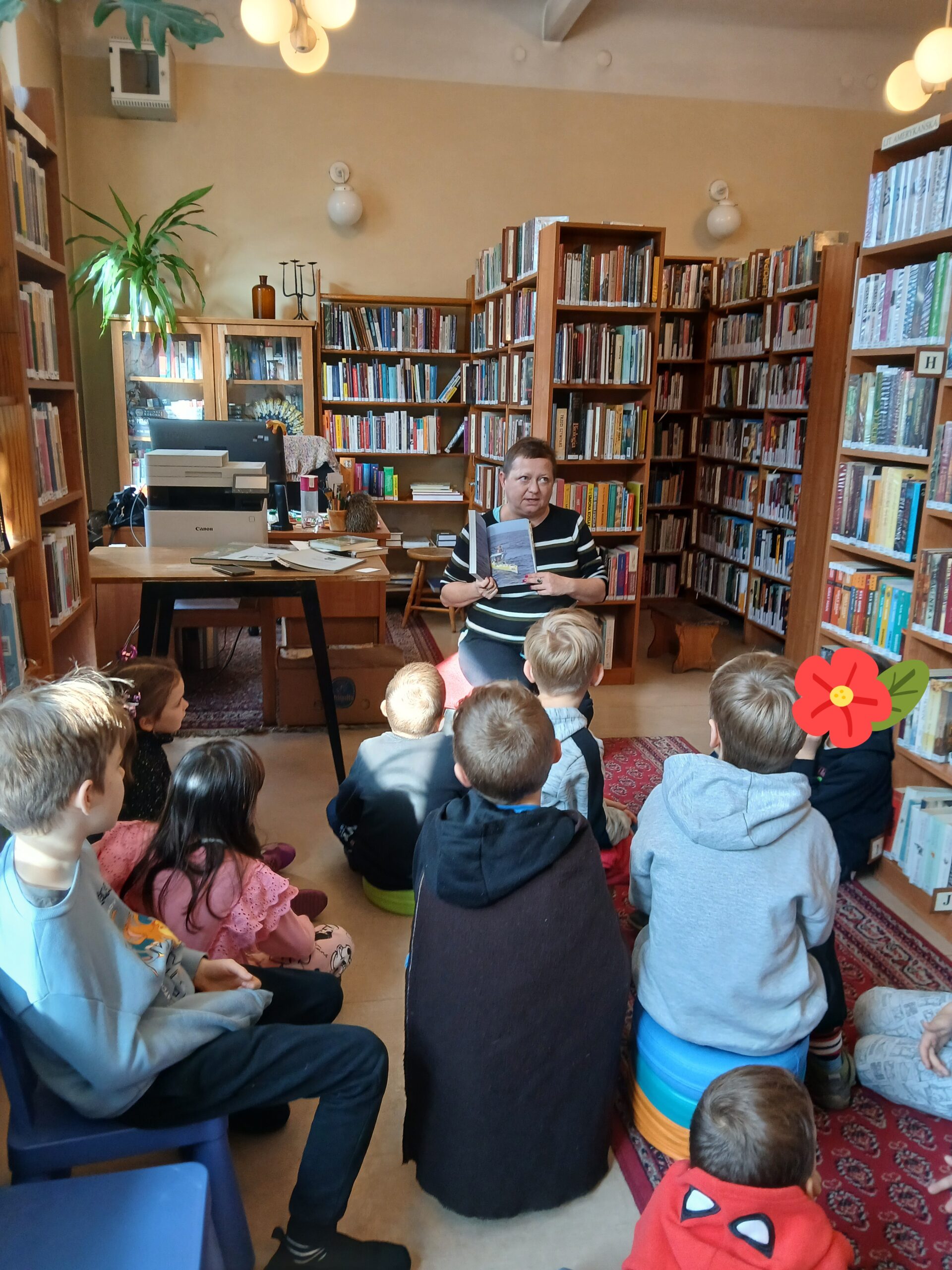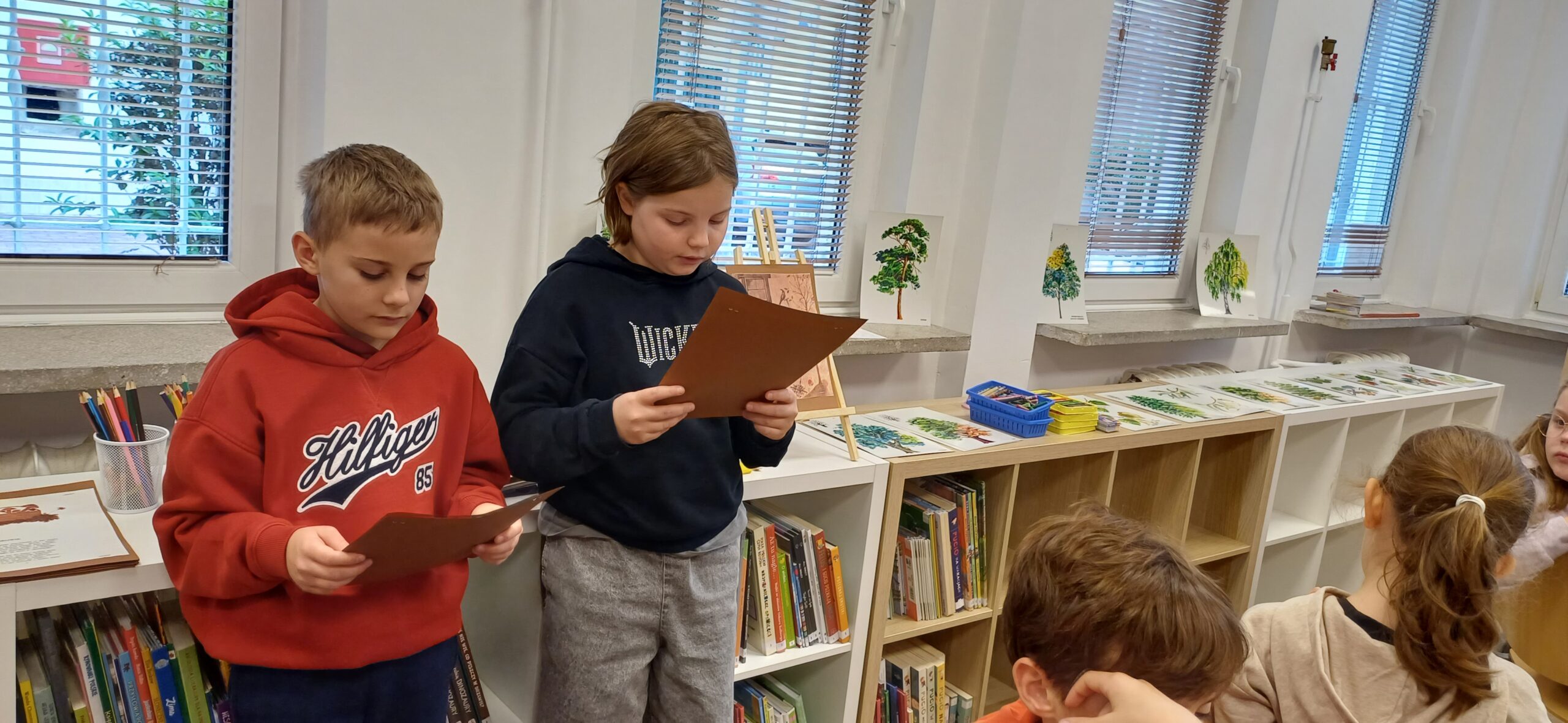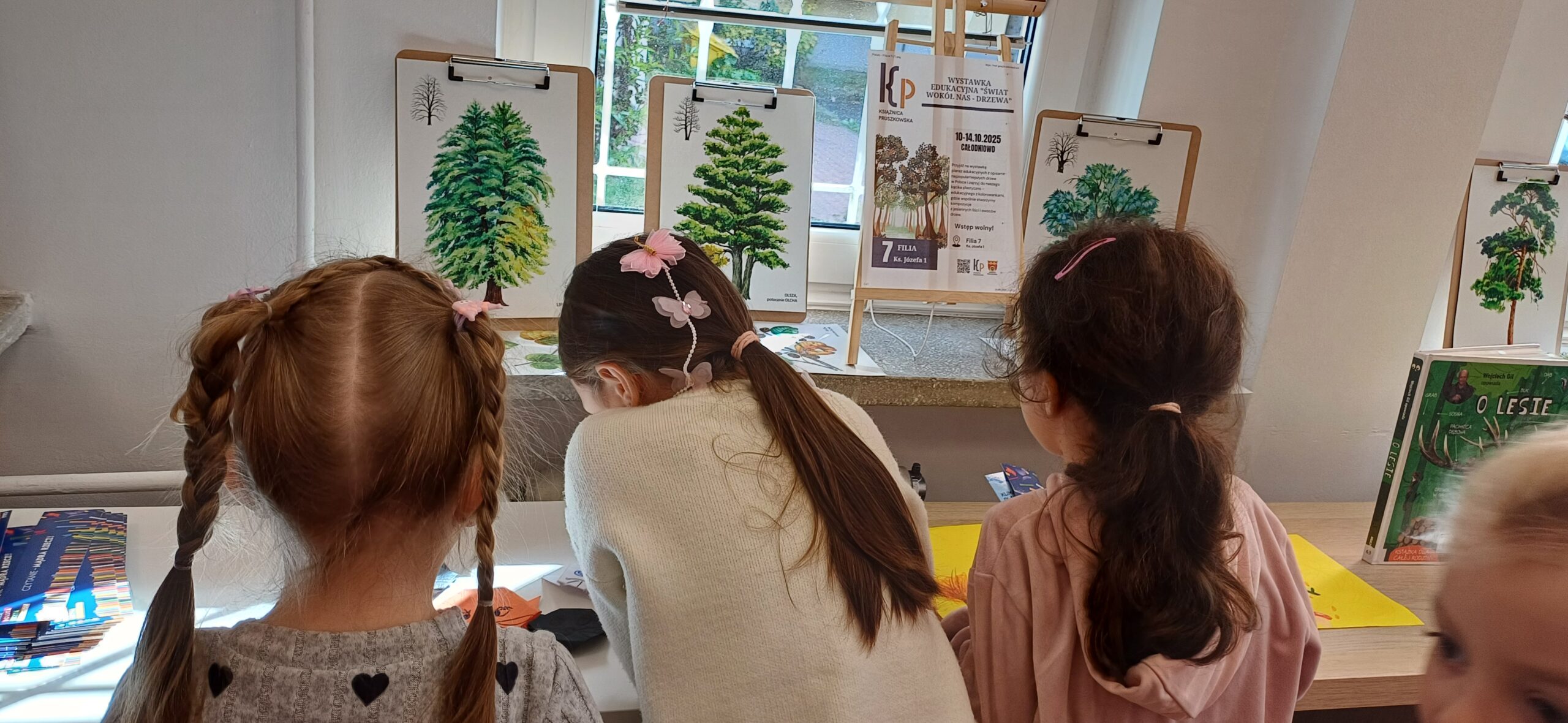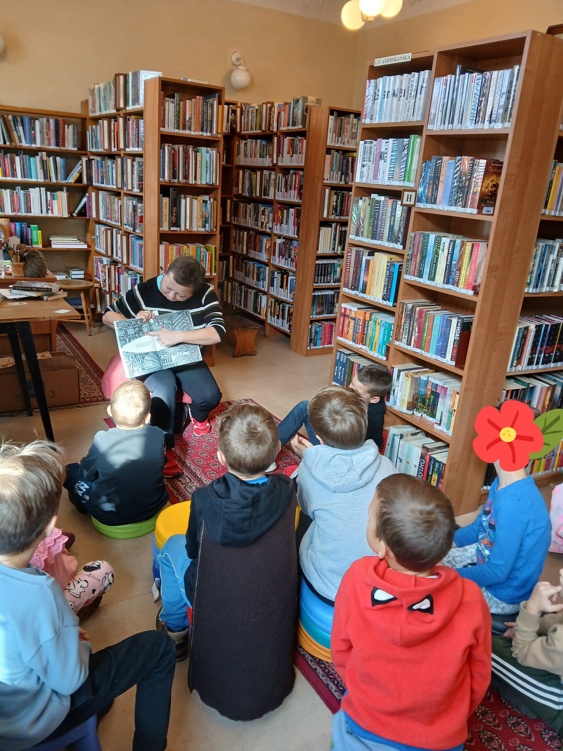 Z okazji Dnia Zwierząt i Dnia Drzewa dzieci z Przedszkola Miejskiego nr 12 obejrzały teatrzyk kamischibai pt. „Powrót do domu” – opowiadający historię uprowadzonych małych lwiątek. Następnie podczas spotkania z poezją poznały wiersze o drzewach – J. Brzechwy, M. Strzałkowskiej i H. Zdzitowieckiej. A, po ich wysłuchaniu tworzyły prace plastyczne z wykorzystaniem liści. Wydarzenie uświetniła wystawka edukacyjna – „Świat wokół nas – Drzewa”. Dziękujemy za czas spędzony w naszej bibliotece. Do zobaczenia!