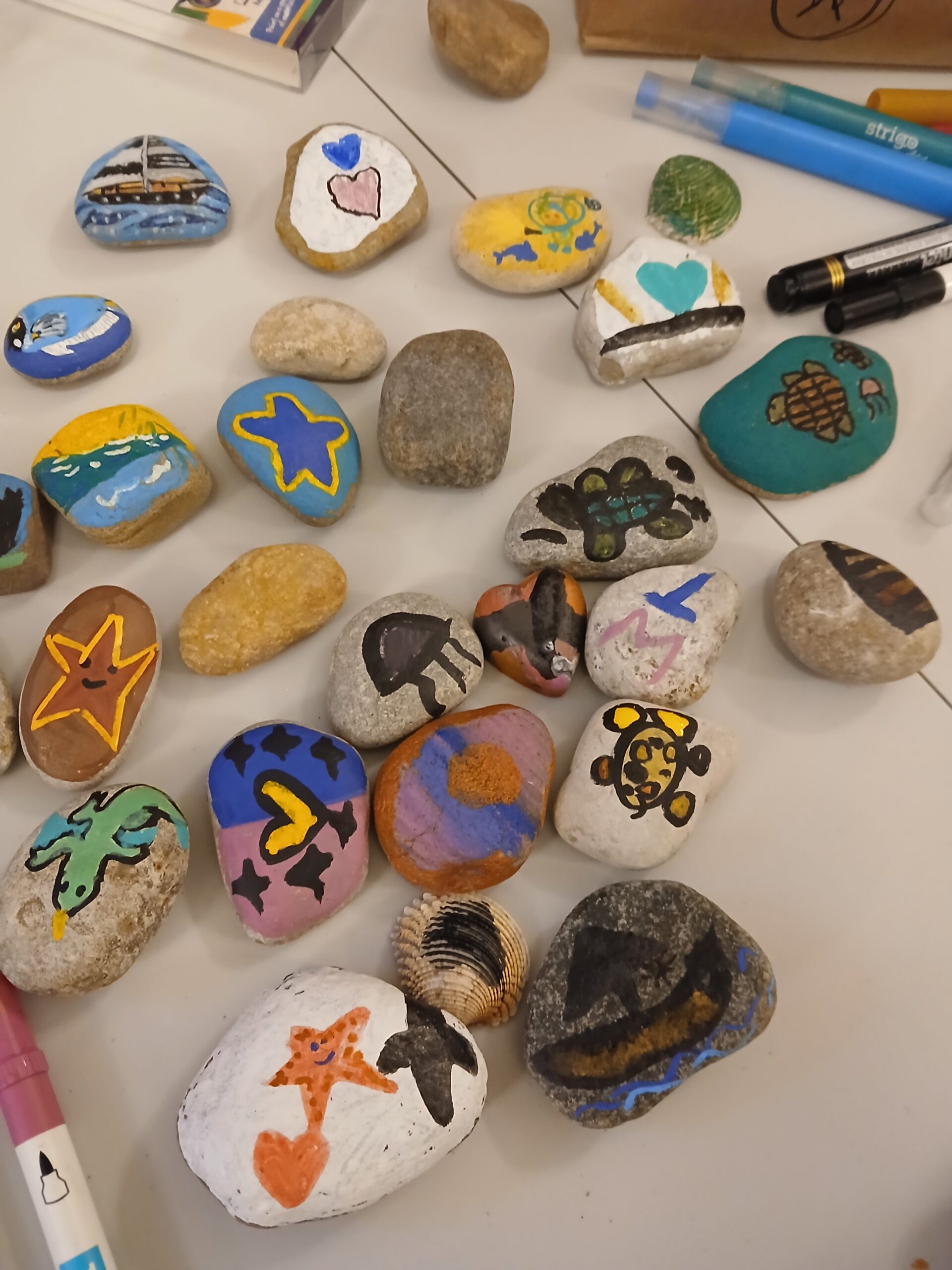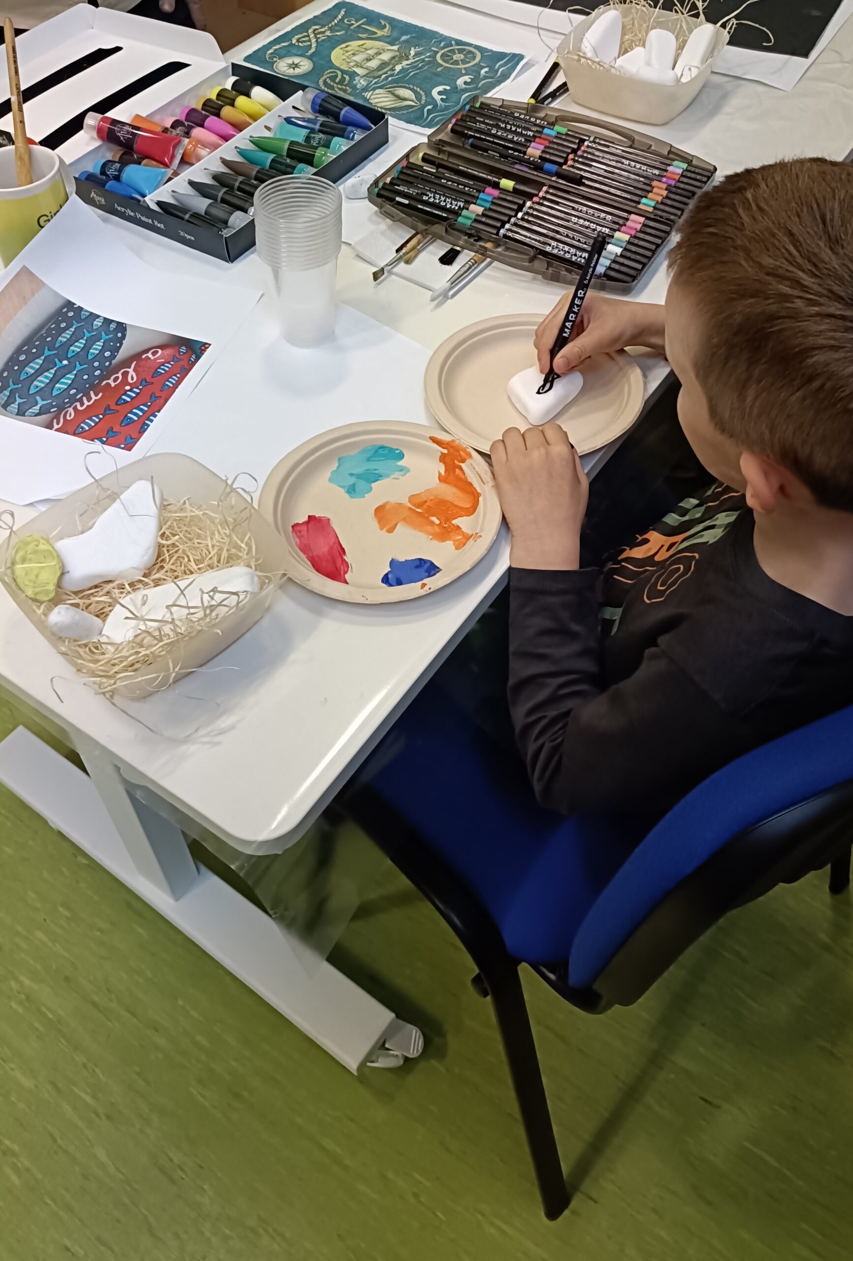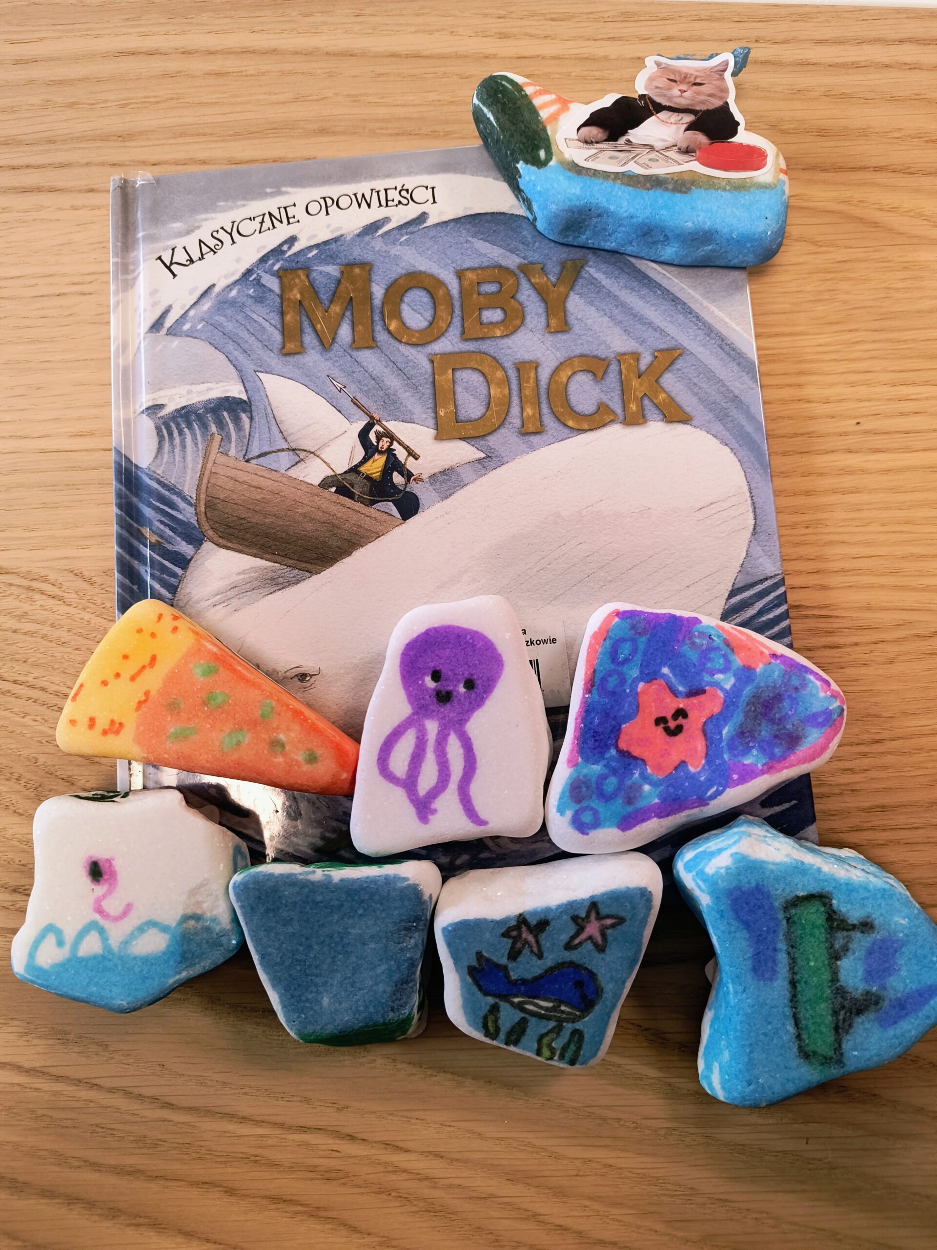 Podczas spotkania uczniowie poznali fragmenty opowieści o legendarnym białym wielorybie – Moby Dicku, a następnie malowali kamienie, inspirowane wysłuchaną historią.