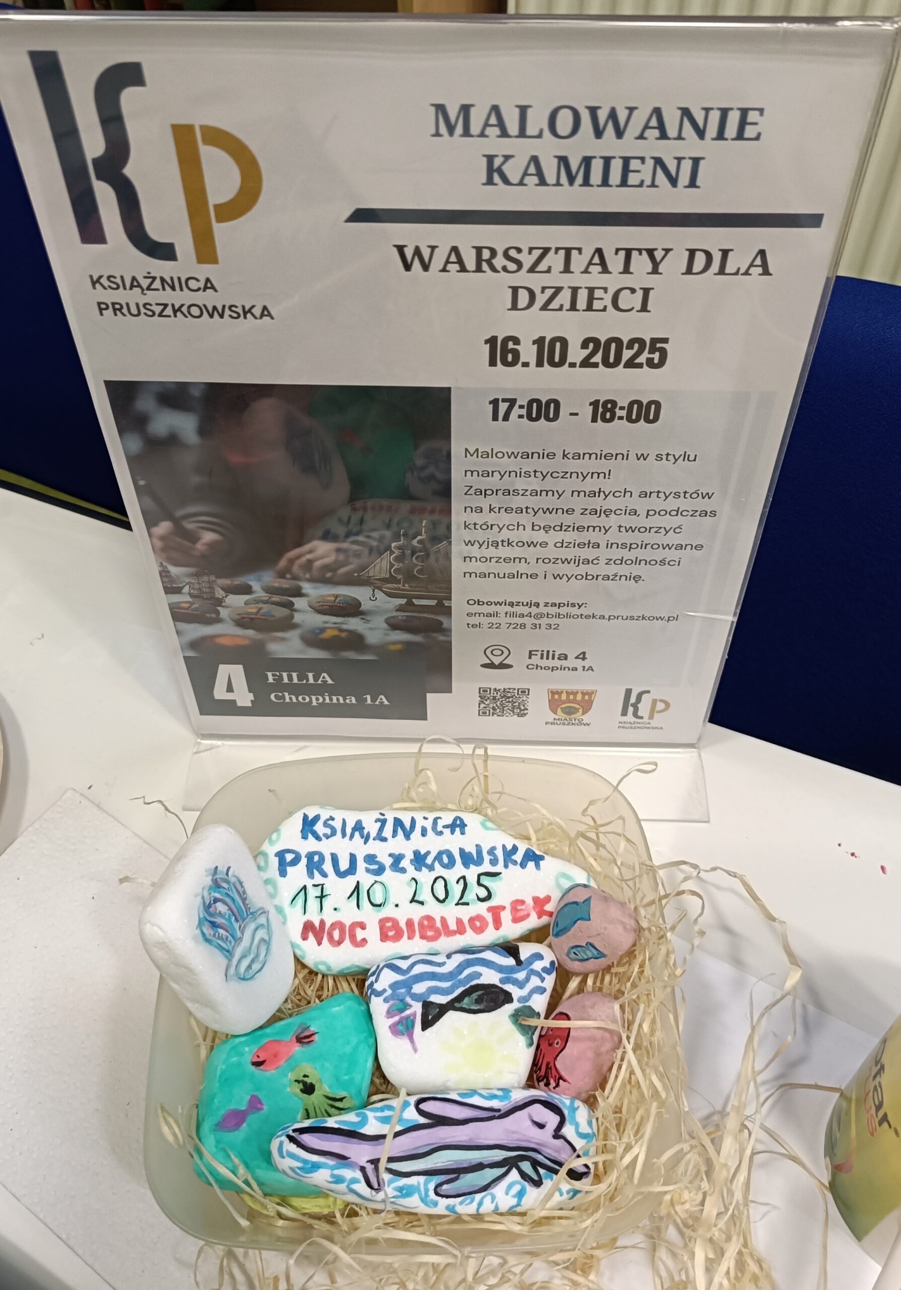 16 października Filia nr 4 Książnicy Pruszkowskiej miała przyjemność przeprowadzić warsztaty z kreatywnego malowania kamieni dla dzieci. Niezmiernie cieszymy się że poprzez zajęcia w Książnicy Pruszkowskiej możemy przyczynić się do rozwijania zdolności manualnych oraz kształtowania wrażliwości estetycznej najmłodszych. Serdecznie dziękujemy za udział i zapraszamy ponownie.