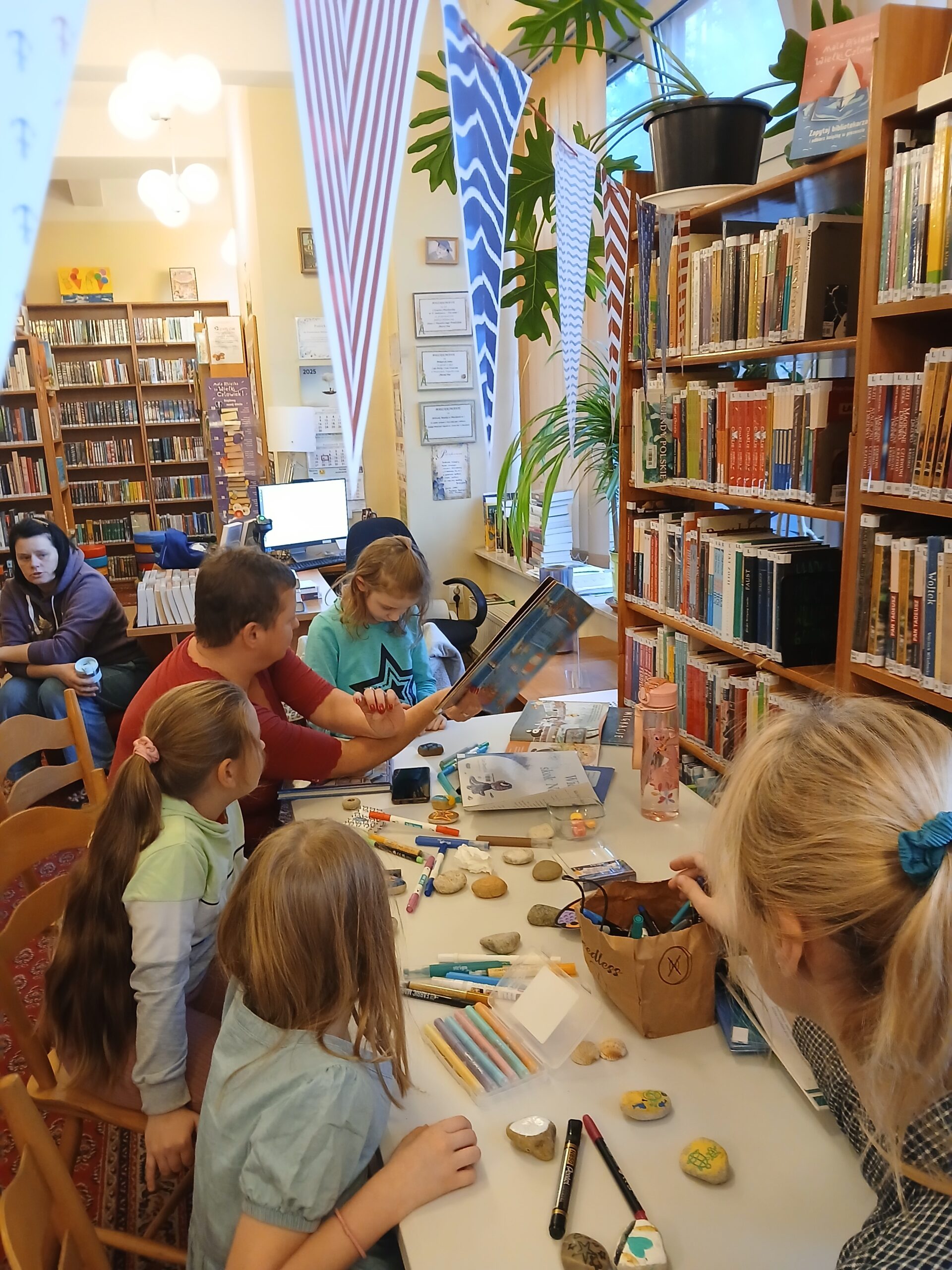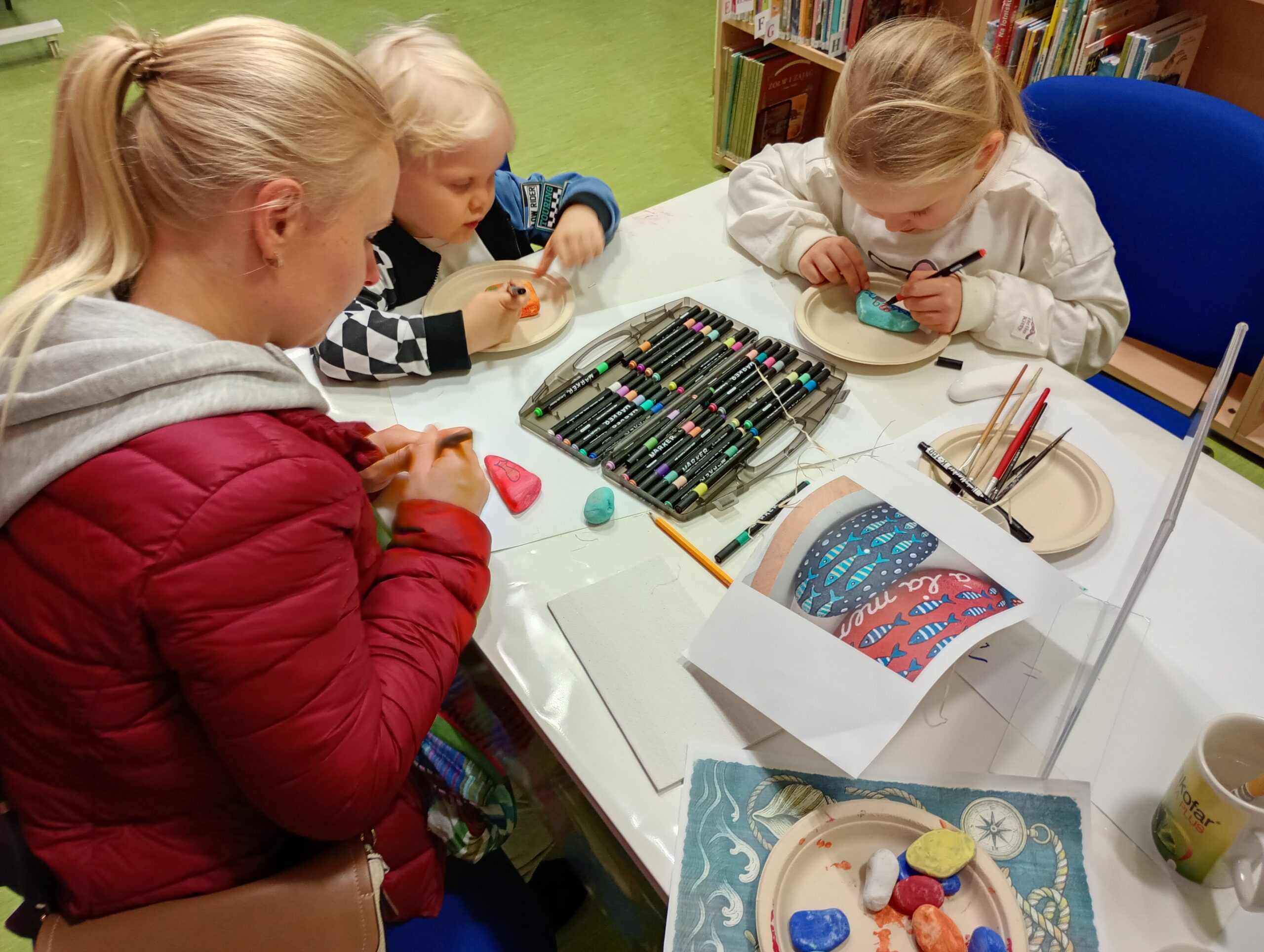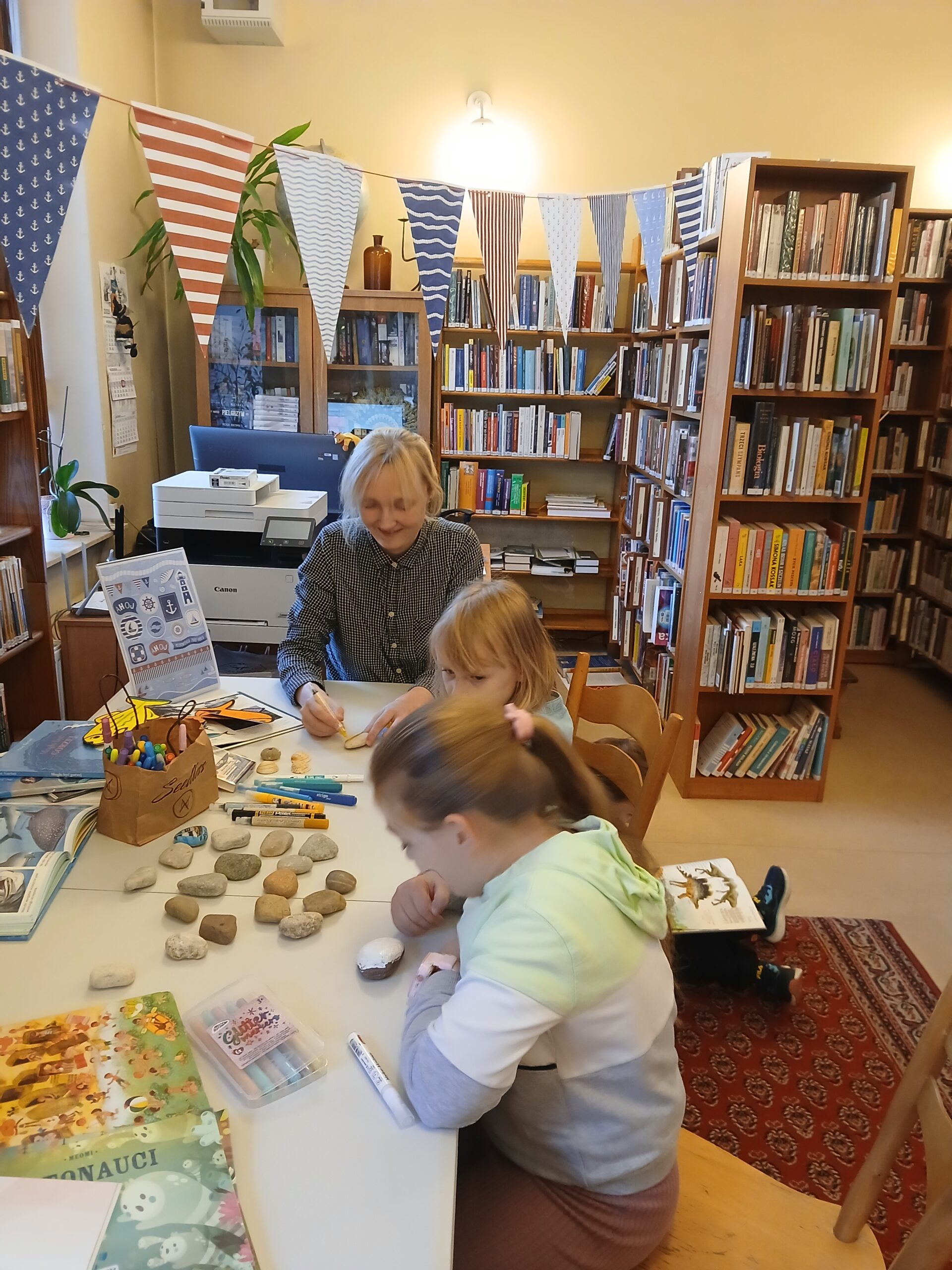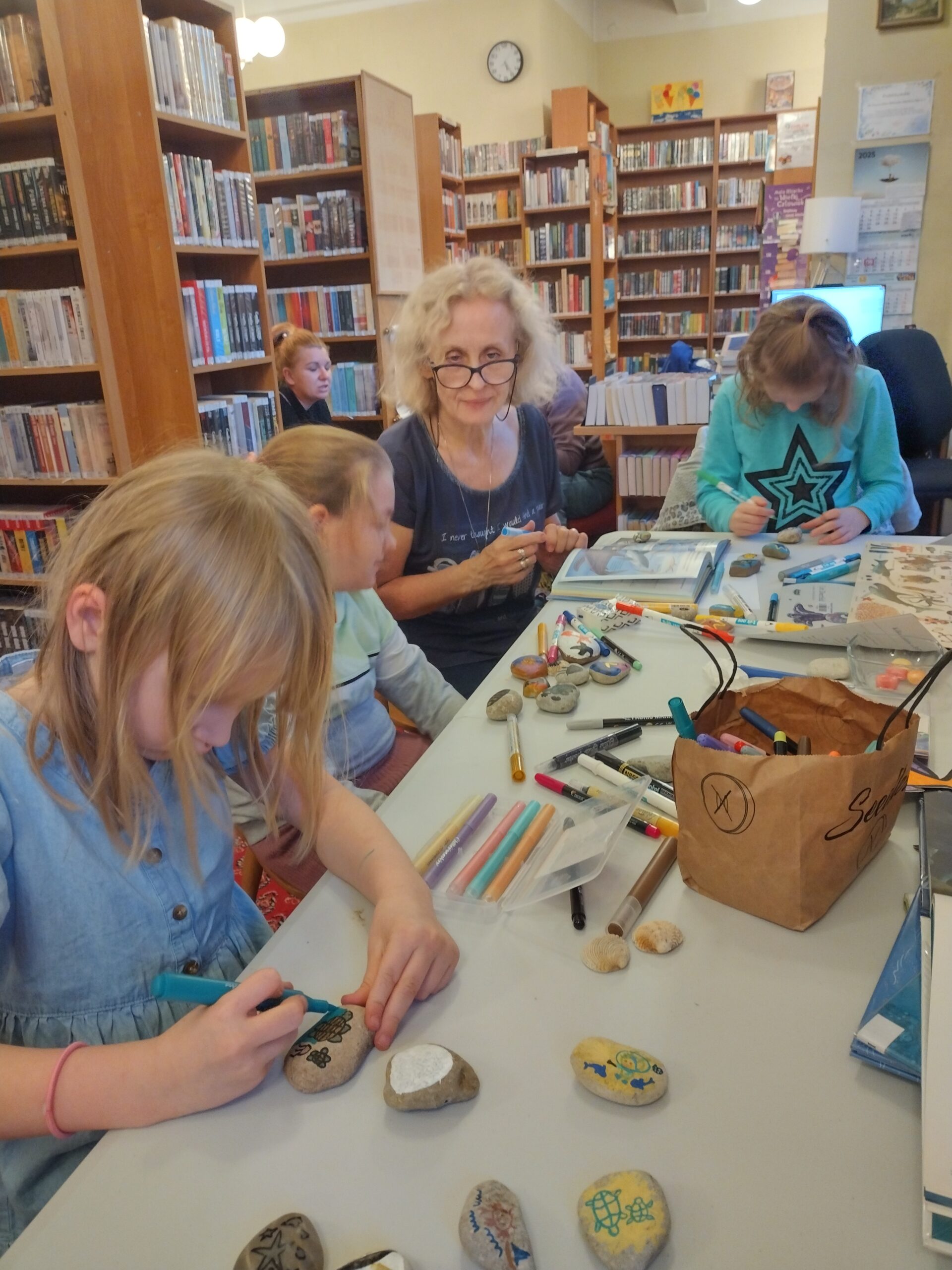 Uczestnicy przeglądali książki o tematyce morskiej, rozmawiali o swoich zainteresowaniach i pięknie zdobili kamienie. Dziękujemy za miło spędzony czas, mamy nadzieję na ponowne spotkanie.