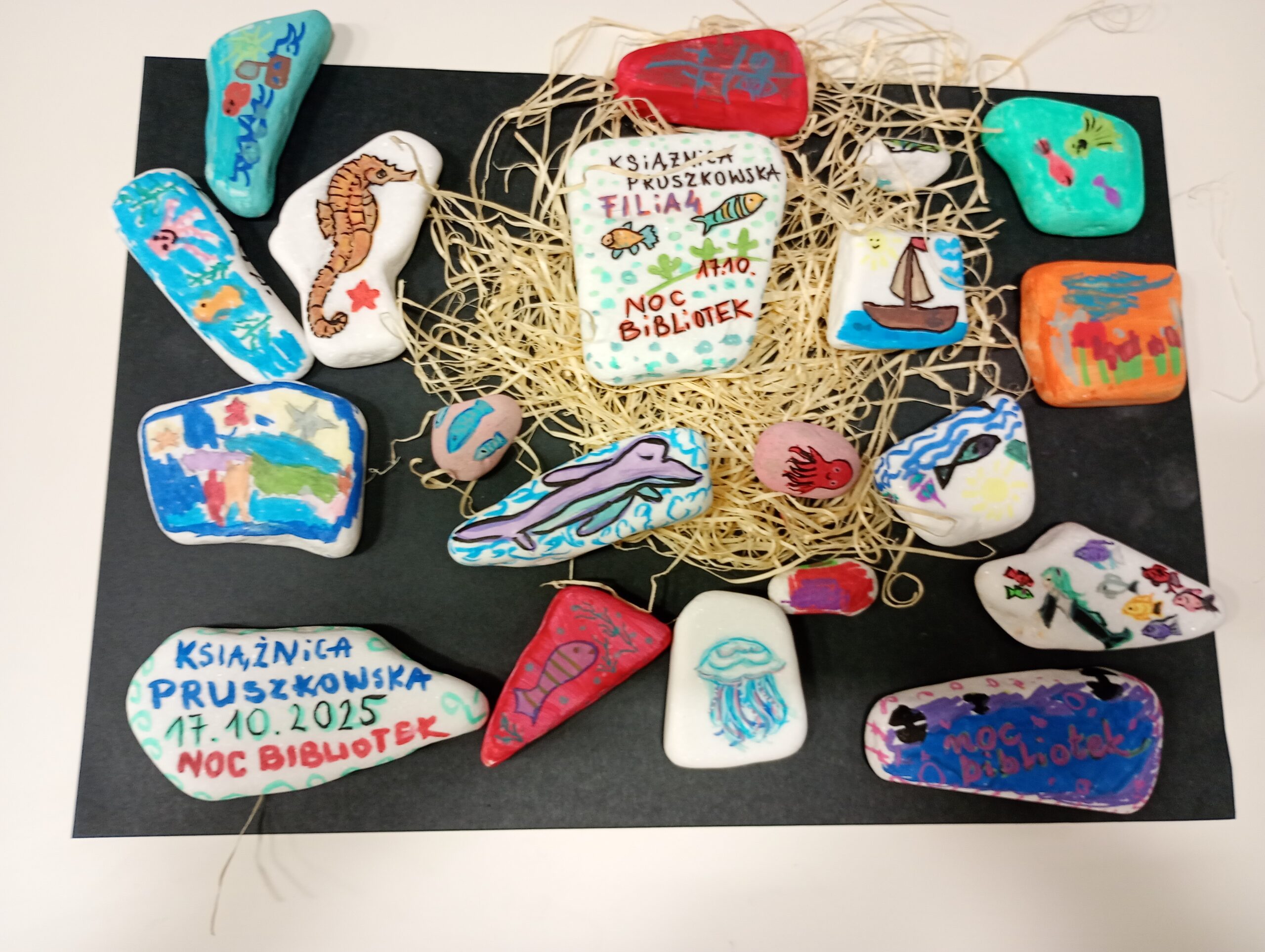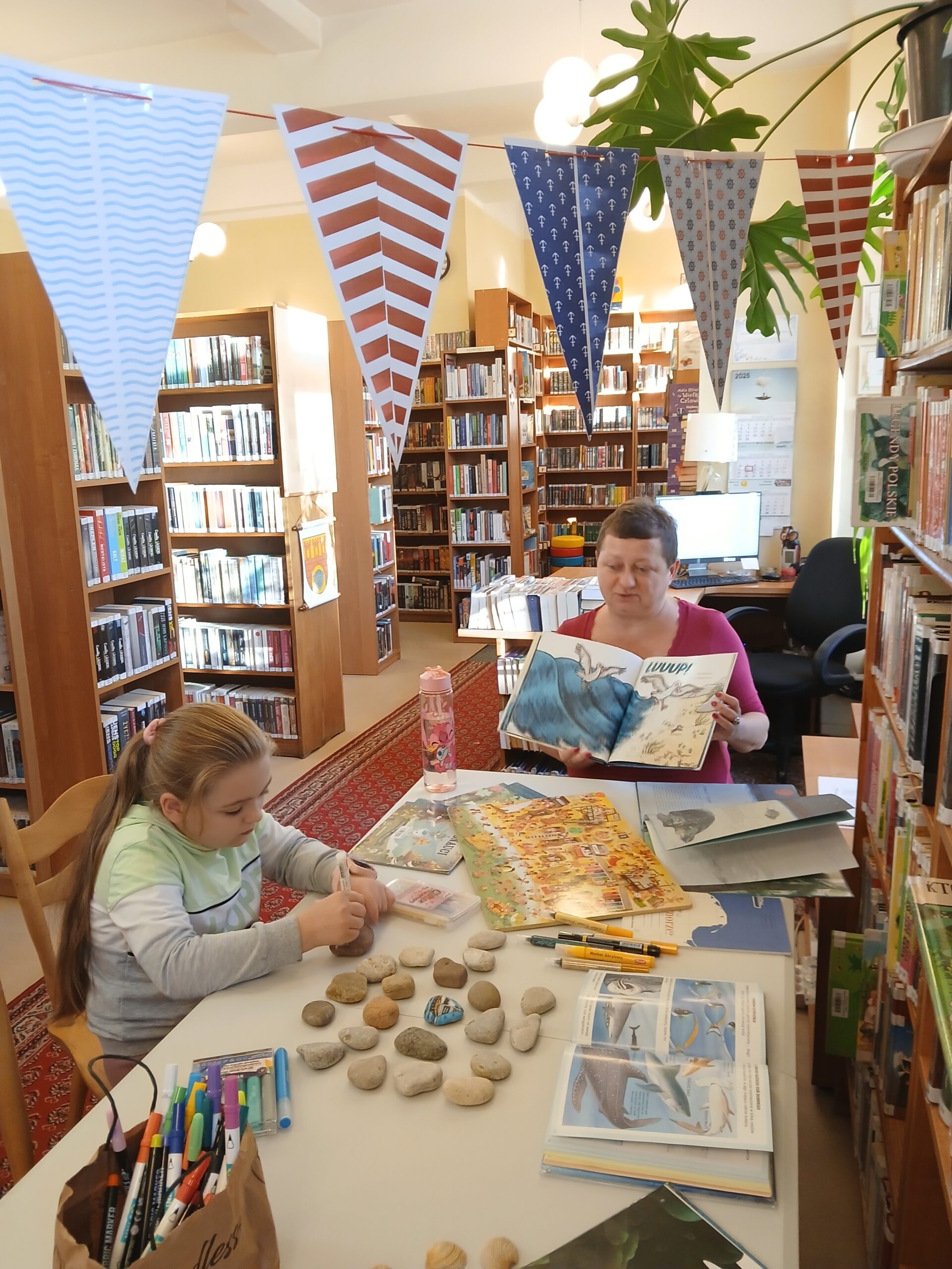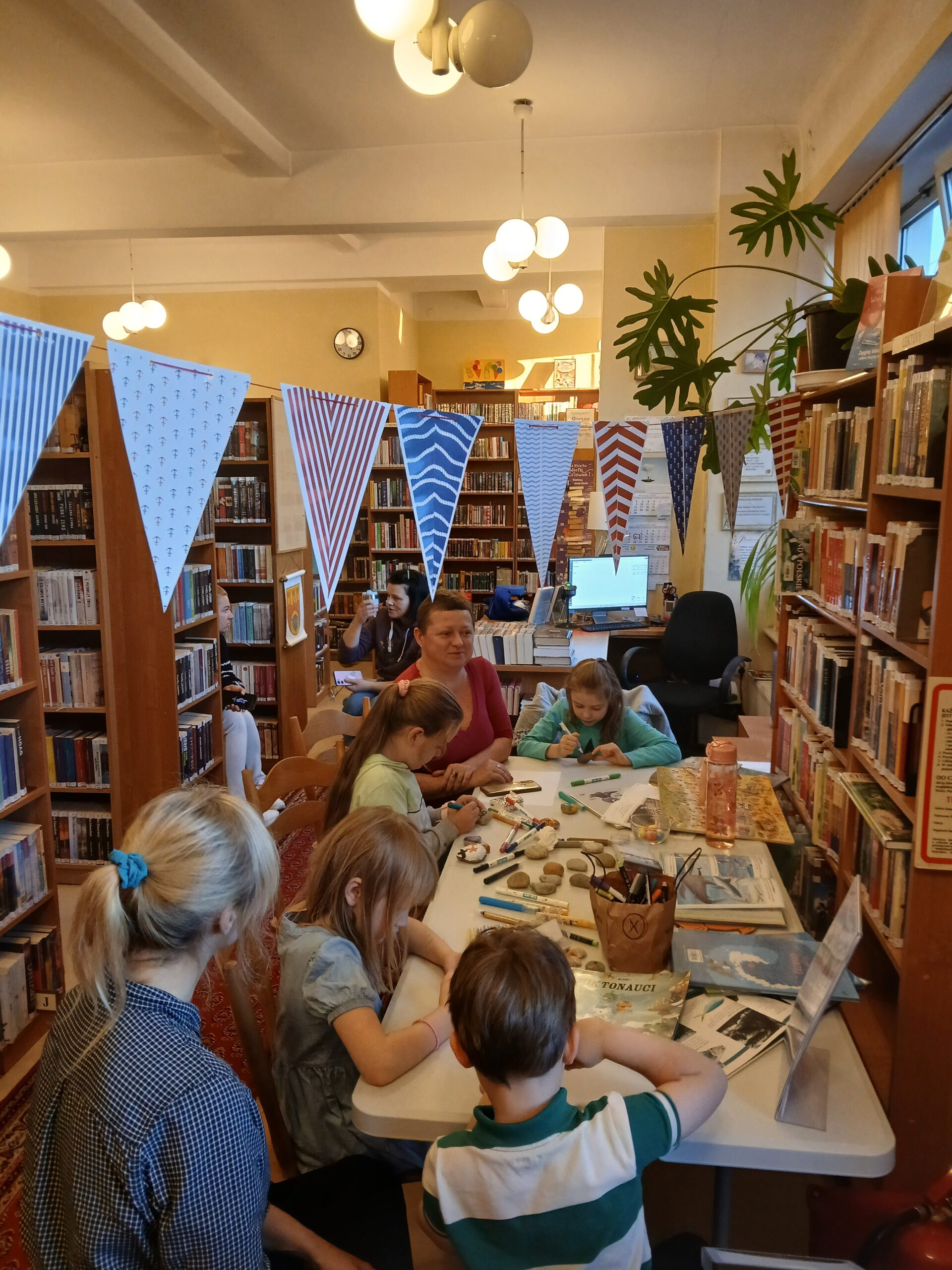 Uczestnicy przeglądali książki o tematyce morskiej, rozmawiali o swoich zainteresowaniach i pięknie zdobili kamienie. Dziękujemy za miło spędzony czas, mamy nadzieję na ponowne spotkanie.