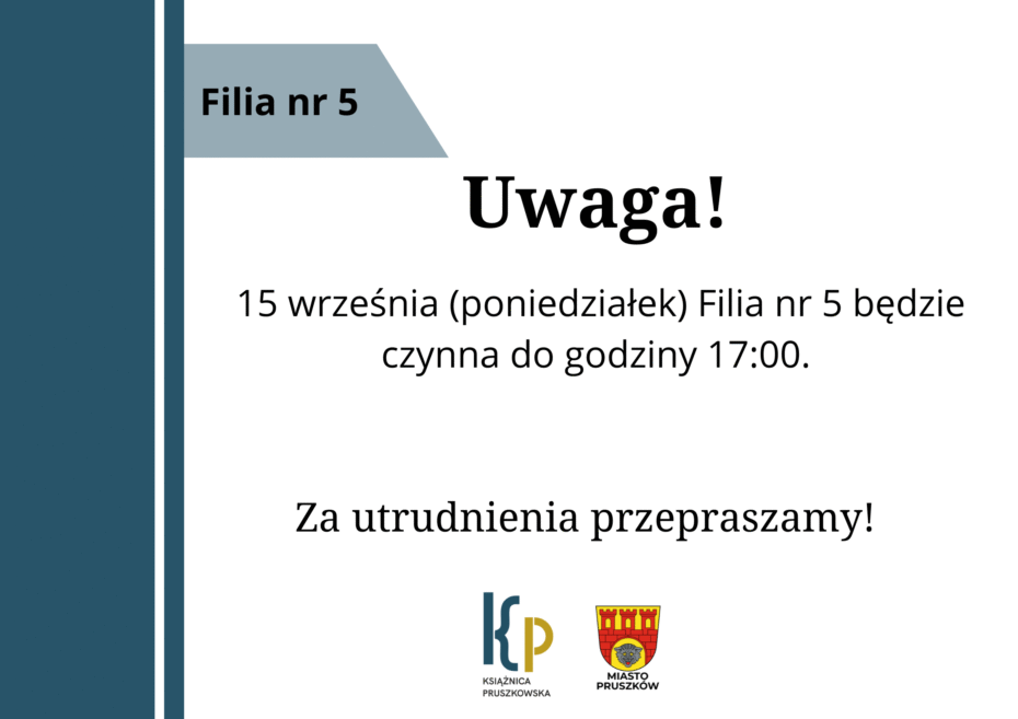 15 września (poniedziałek) Filia nr 5 będzie czynna do godziny 17:00.