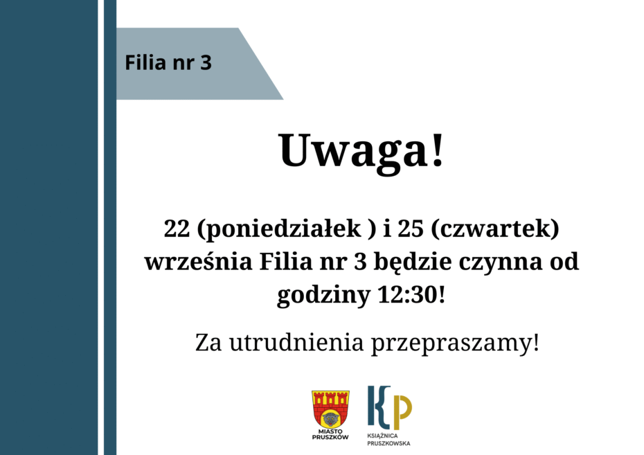 22 (poniedziałek ) i 25 (czwartek) września Filia nr 3 będzie czynna od godziny 12:30!
